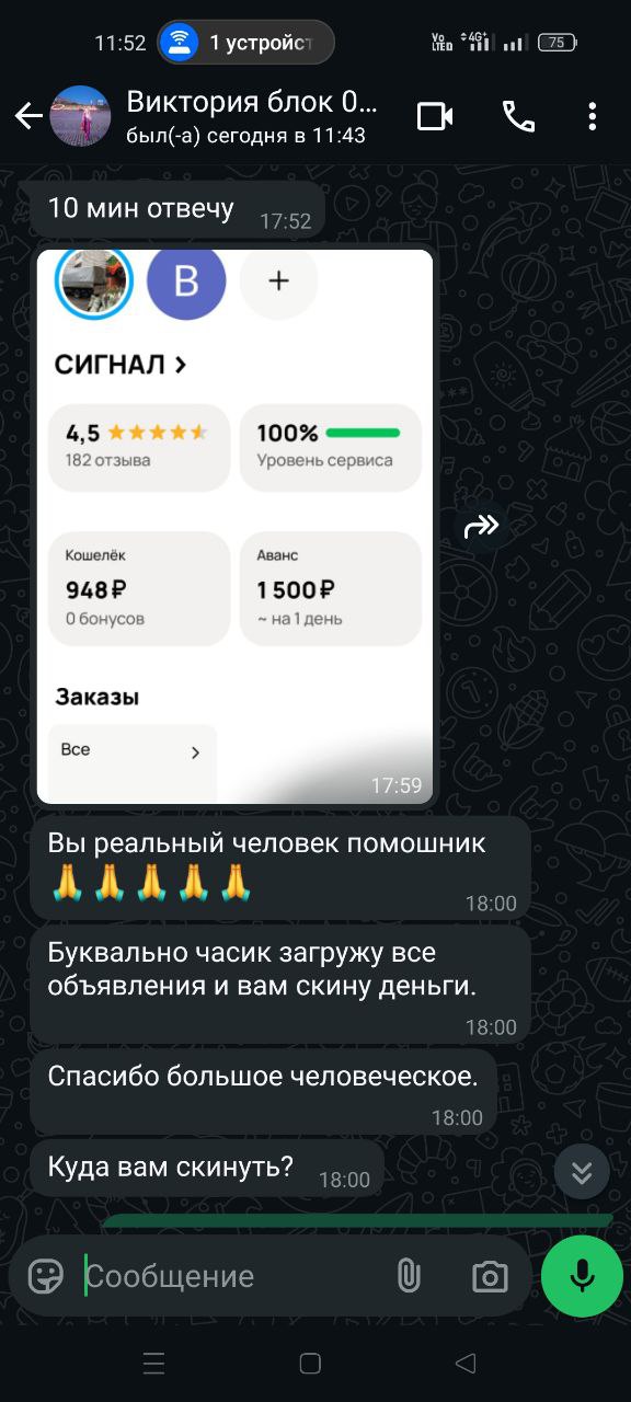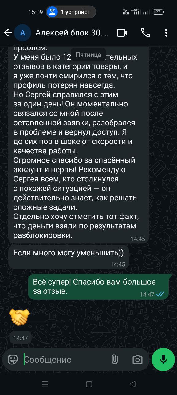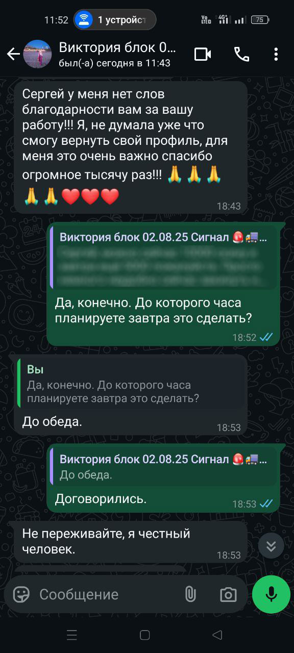 Но Сергей справился с этим за один день! Он моментально связался со мной после оставленной заявки, разобрался в проблеме и вернул доступ.