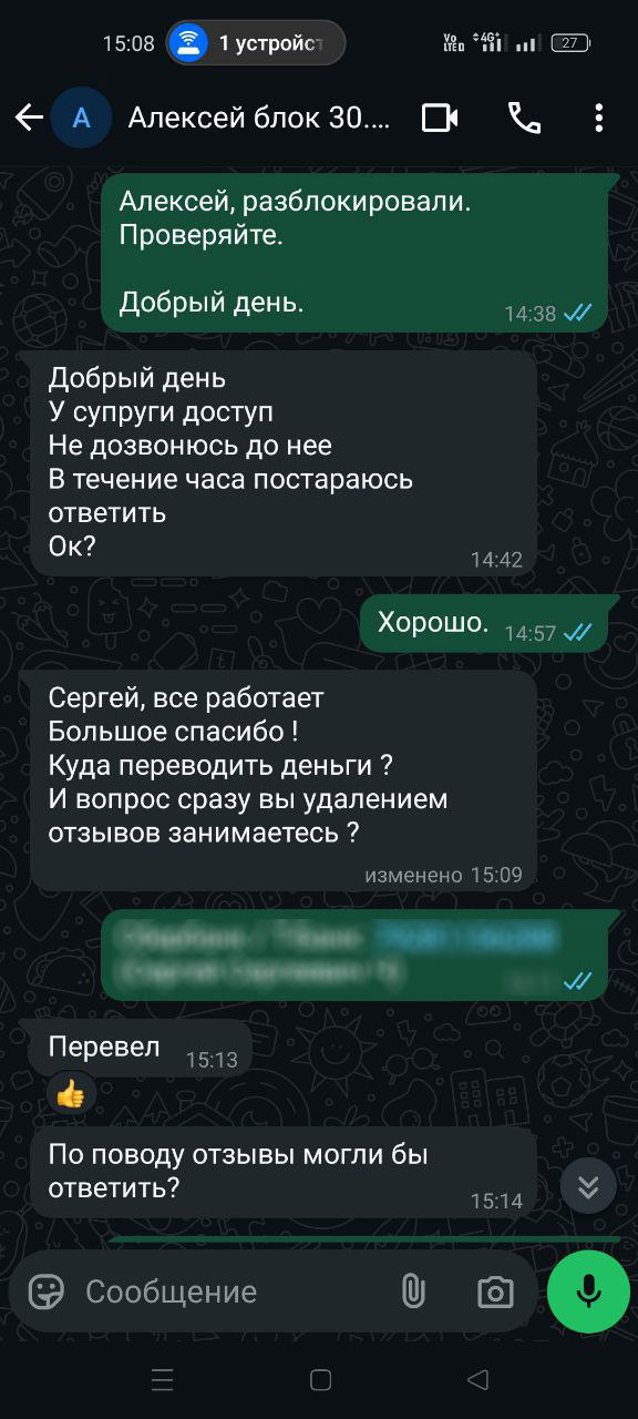 Отдельно хочу отметить тот факт, что деньги взяли по результатам разблокировки.